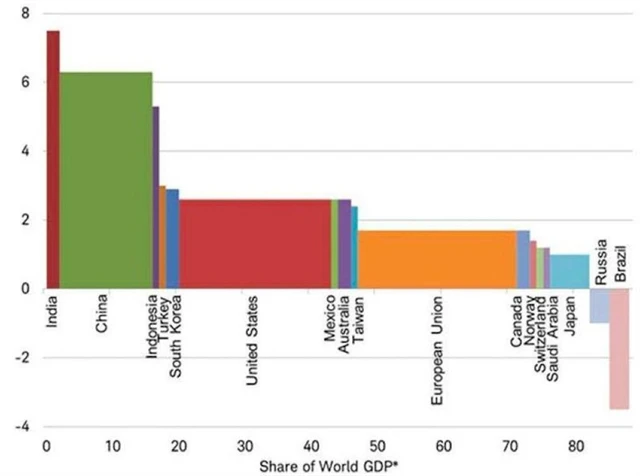 Graf níže ukazuje podíl jednotlivých ekonomik na světovém HDP a jejich očekávaný růst v roce 2016 podle MMF. Je z něj jasně patrné, že některé nejrychleji rostoucí ekonomiky nemají až tak velkou váhu ve světovém hospodářství (Indie, Indonésie), a naopak těžké globální váhy mají růst výrazně pomaleji (Evropská unie, USA).