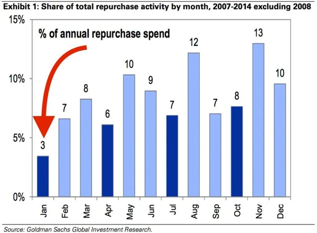 Je ale potřeba připomenout, že poptávka po akciích ze strany samotných firem není během roku rovnoměrná. A v lednu bývá v posledních letech dokonce nejmenší z celého roku. Nejsilnější naopak bývají listopad a prosinec (což se na výkonu amerických akcií v uplynulém roce nepochybně podepsalo pozitivně; o to šedivěji ale působí kondice trhu při představě, "jak by bylo" bez odkupů).
