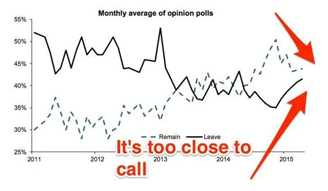 Ve výhledu švýcarské banky Credit Suisse na rok 2016 je mimo jiné graf ukazující vývoj počtu lidí přejících si setrvání Spojeného království v EU a těch, kteří by naopak nejraději dali evropskému společenství sbohem. Pro setrvání země v EU by aktuálně hlasovalo necelých 45 % lidí, pro vystoupení z EU by se vyslovilo asi 42 % oprávněných voličů.