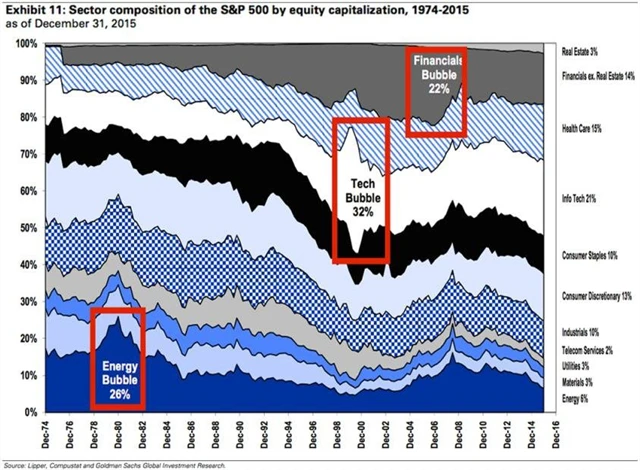 David Kostin z Goldman Sachs zaktualizoval graf vah jednotlivých sektorů v indexu S&P 500. Z něj jsou jasně patrné bubliny v odvětví technologií okolo roku 2000 nebo ve finančním sektoru před poslední globální krizí.