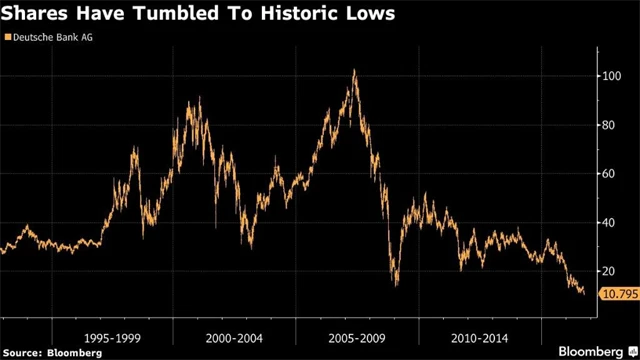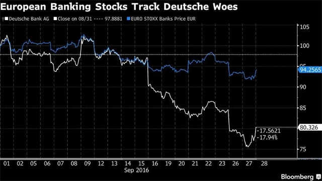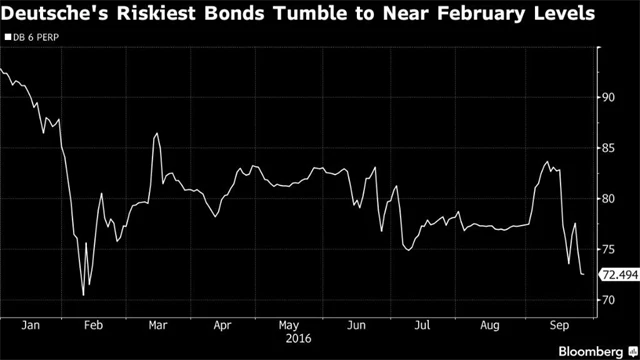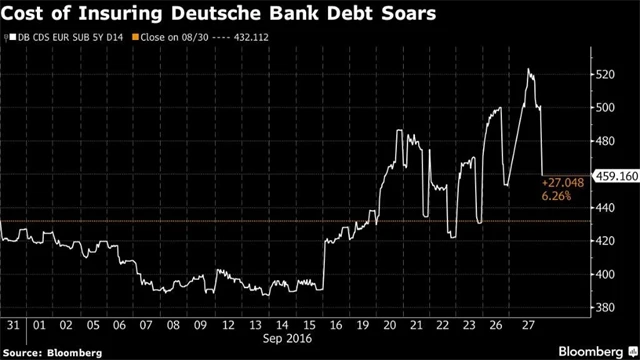 Nad Deutsche Bank se stahují černá mračna a banka bude mít, zdá se, velký problém se z nich dostat a opět získat přízeň investorů. Ti si začínají připomínat rok 2008 a banku Lehman Brothers. Některé jiné banky (Goldman Sachs) nebo média (Wall Street Journal) uklidňují emoce a tvrdí, že na tom Deutsche Bank není tak špatně, v pátek se navíc objevily informace, že by banka měla platit výrazně nižší vyrovnání za obchody s hypotečními aktivy v době před krizí.