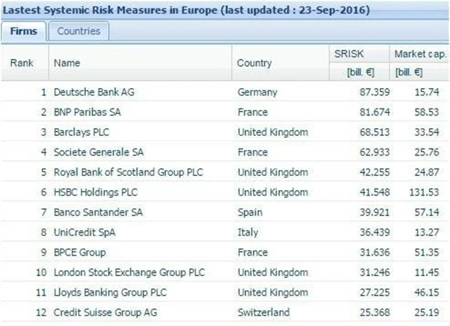 "Mezinárodní měnový fond ji navíc označil za systémově významnou instituci. Černý scénář v podobě krachu instituce tak představuje významné riziko, jež se trhy aktuálně snaží započítat do svých očekávání," doplnil Jan Šumbera z České spořitelny. Podle MMF je Deutsche Bank jedním z "největších přispěvatelů k systémovému riziku" mezi systémově významnými bankami, následovaná HSBC Holdings a Credit Suisse Group.