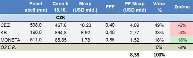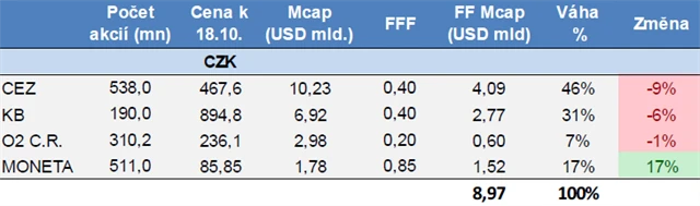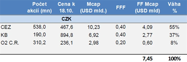 Index MSCI Czech je aktuálně složen ze tří akciových titulů - ČEZ s více než poloviční vahou, Komerční banky se 37 % a O2 Czech Republic s 8% podílem. V současnosti vnímáme jako velice nízkou pravděpodobnost (10 %), že by se složení indexu nezměnilo, jelikož MONETA splňuje všechna stanovená kritéria pro zařazení do indexu. Jediný problém shledáváme v tom, že kumulativní free float tržní kapitalizace mírně překračuje 90 %.