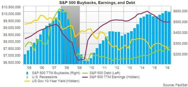 Návratnost investovaného kapitálu v posledních letech ovšem klesá. Jinými slovy, firmy nedokáží získaný kapitál investovat při stejné návratnosti jako v minulosti. Hlavní vina leží na energetickém sektoru, lze nicméně pojmout podezření, že se jedná o potvrzení výše zmíněné obavy z nedostatku zajímavých investičních příležitostí. I proto není nikterak neobvyklé (a s ohledem na levné financování je to vlastně i poměrně rozumné) využití dluhových linek k odkupu vlastních akcií.