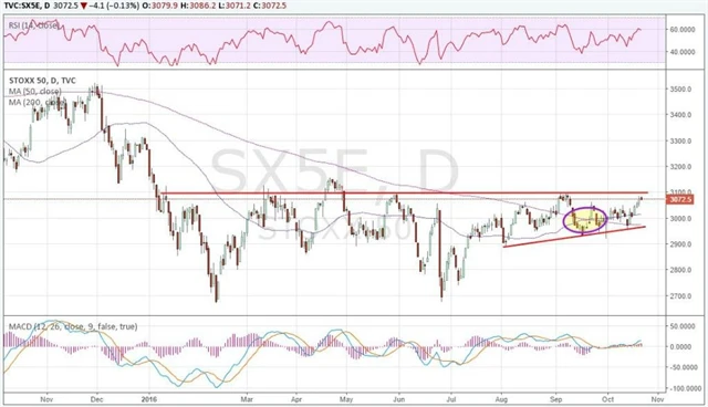 A nakonec ještě dva indikátory mimo cenový graf. RSI (nad cenovým grafem) se v poslední době převaloval mezi 40 a 60 body a momentálně je na šedesátce. Když se vydá výše, bude to další podpora býčího trendu, stejně jako v případě MACD (pod cenovým grafem), která je již nad nulou. Potvrzení nákupního signálu by mělo přijít s růstem indexu nad 3 100 bodů. Nad 3 160 body, což je lokální maximum z dubna, bude signál ještě silnější. Mimochodem, v pondělí se Euro Stoxx 50 nad 3 100 pohyboval po většinu dne, v závěru se ale vrátil lehce pod tuto úroveň.