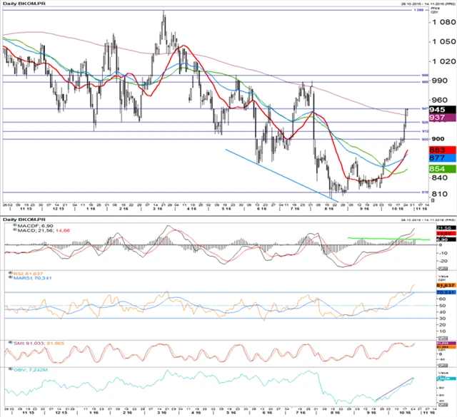Akcie Komerční banky prošly všemi rezistencemi bez většího zaváhání a nyní růst rozdýchávají na 947 Kč. Problém s rezistencemi je ten, že jsou založeny na hodnotách z doby před změnou dividendové politiky, lepší k dispozici nejsou. MACD nadále roste do nebes a odstup od signální linie se opět zvětšil, zatím však stále v rámci sestupného trendu. RSI je extrémně vysoko, jeví však již známky poklesu. To však jako v minulosti nemusí nutně znamenat výrazný medvědí signál. SMI je nadále vysoko, ale bez známky změny trendu. Rally se zdá jako nekonečná. Pro následující týden vykazuje zpomalení zejména RSI, současná úroveň dalších indikátorů je na ročních maximech. Očekáváme tedy zpomalení růstu až stagnaci.