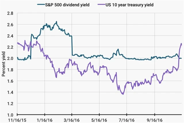 Jenomže první dny po amerických volbách rozhýbaly ustálenou tržní hladinu. Výnosy dluhopisů rychle narostly a s nimi i ceny akcií, investoři celkově vyhodnocují možnou Trumpovu politiku jako ekonomicky minimálně snesitelnou, ne-li příznivou. Růst cen akcií ale zároveň způsobil mírný pokles dividendového výnosu celého trhu. Po necelém roce je tak výnos 10letých vládních dluhopisů USA opět výše než dividendový výnos v rámci indexu S&P 500.