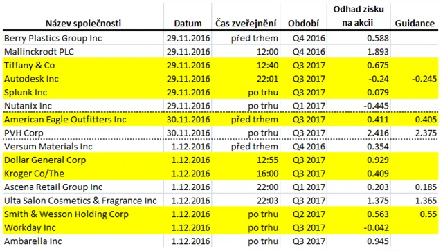 Které světové firmy představí výsledky hospodaření za uplynulý kvartál v týdnu od 28. listopadu a jaké zisky v rámci indexu S&P 500 a od jednotlivých společností očekávají analytici oslovení agenturami Thomson Reuters a Bloomberg?