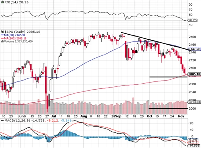 Index S&P 500 prolomil dlouhodobý support 2 120. Tím se denní graf změnil na medvědí. I přes dlouhou šňůru červených svíček je ale propad zatím postupný a mírný.