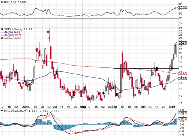 Index volatility VIX vylétl k úrovním, na nichž se pohyboval po britském referendu a na začátku roku. Po rychlém růstu v několika posledních případech přišel také rychlý pokles.