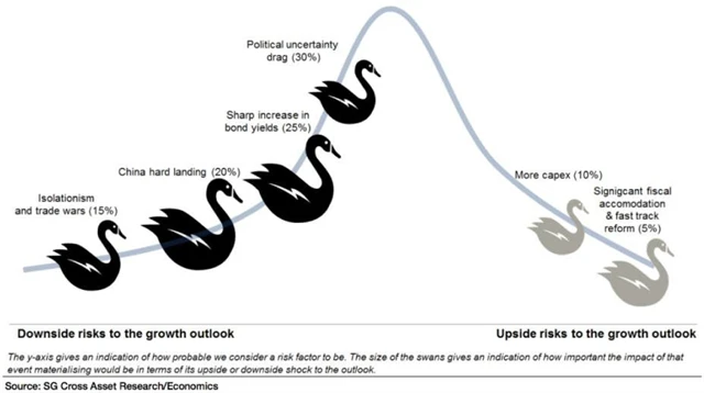 Supervelmoc opouštějící své výsostné postavení povede populista s minimální znalostí pravidel a principů globální hry. Nastupující velmoc čelí politickým i hospodářským výzvám, které ji dlouhodobě řadí mezi hnízdiště černých labutí. Evropská unie, největší ekonomický blok světa, se v důsledku impotence elit drolí, přičemž seriál plebiscitů v klíčových zemích v kombinaci s přetrvávajícími strukturálními problémy některých členů unie hrozí zkrácením poločasu rozpadu.