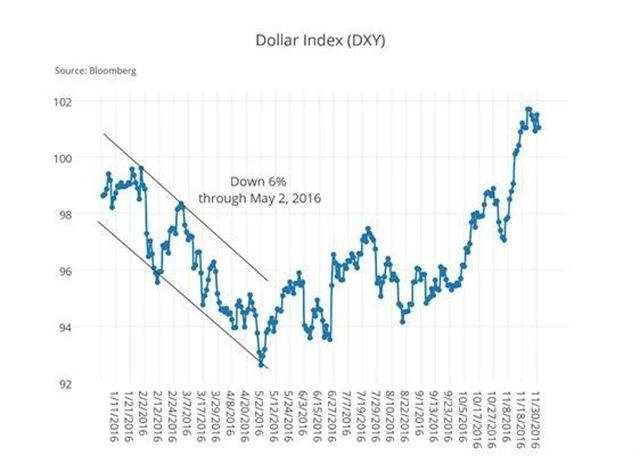Očekávání s tím spojená (a další faktory, například zvolený prezident Trump) dělají z dolaru jednoho z vítězů letošního roku. Centrální banka svůj postoj během roku upravovala a došlo nakonec jen na jedno zvýšení základní sazby. To během roku přispívalo k oslabování dolaru a posilování japonského jenu.