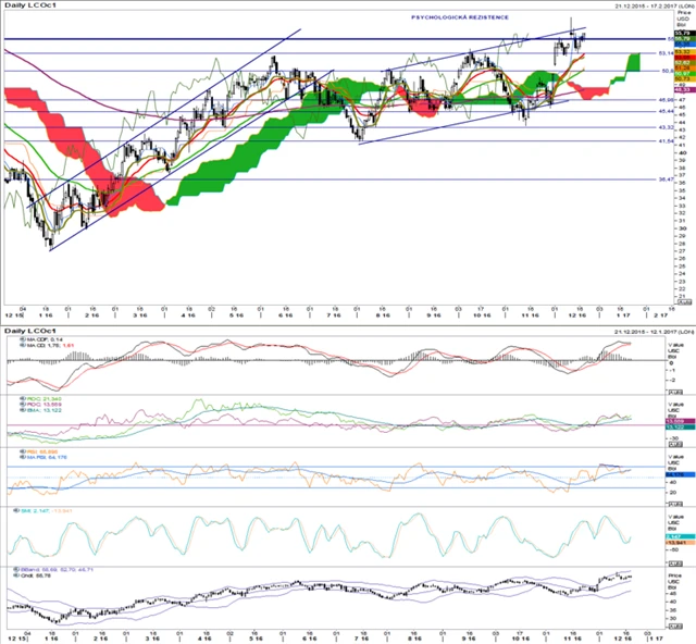 Cena ropy se pohybovala stranou podél rezistence na úrovni 55 dolarů za barel. Nadále se nachází nad klouzavými průměry. MACD se chystá shora protnout signální linii. Histogram je téměř zpět na nule. Naopak RSI proťal svůj klouzavý průměr a míří nahoru. Rovněž SMI zastavil svůj pokles a zespodu překřížil svoji pomalejší linii. Technické indikátory vysílají smíšené signály. Proto nadále očekáváme pohyb stranou v intervalu 53-55 dolarů za barel.