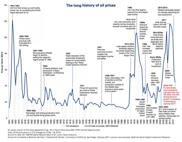150 let vývoje ceny ropy v jediném grafu (23. 12. 2016)