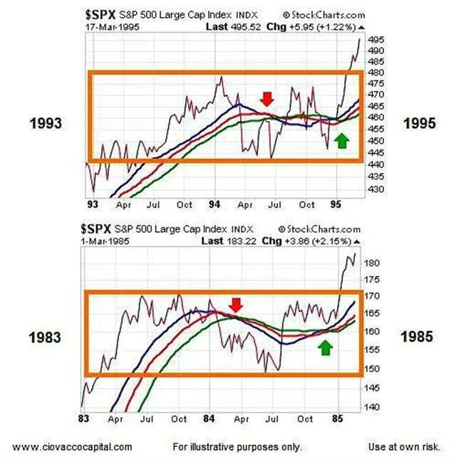 Podobných období konsolidace trvajících dva roky jsme byli svědky také v letech 1993–1995 a předtím také v letech 1983–1985. Po nich index zaznamenal v obou případech poměrně výrazný nárůst.