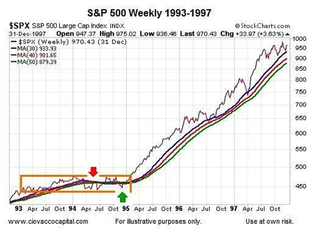 Obecně platí, že čím delší je vývoj cen akcií do strany, tím větší pohyb v budoucnu lze očekávat, a to oběma směry. Níže je příklad z roku 1995.