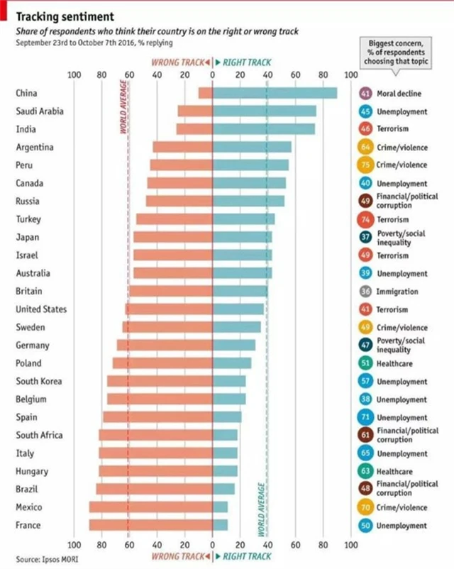 Tu může nakonec namísto obávané špatné zprávy spustit plíživá špatná nálada. Ta je v kombinaci s nervy napjatými kvůli faktorům zmíněným v úvodu k prasknutí zvláště nebezpečná. Průzkumy veřejného mínění opakovaně potvrzují, že podstatná část západní společnosti navzdory hospodářskému růstu propadá skepsi, což je do značné míry dáno relativním poklesem životní úrovně – příjmy 70 % domácností v rozvinutých zemích v letech 2005-2014 stagnovaly či poklesly. Lidé již výslednou frustraci dali najevo prostřednictvím volebních lístků. Stanou se trhy dalším kanálem?