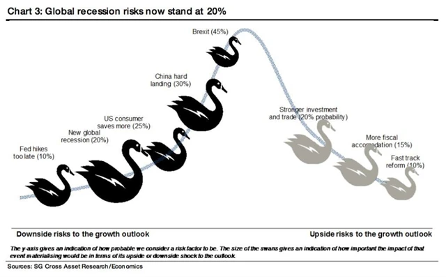 Société Générale každého čtvrt roku aktualizuje graf, do kterého zakresluje potenciální černé labutě, tedy události, které by výrazně ovlivnily světovou ekonomiku. Takto vypadal na konci února 2016.