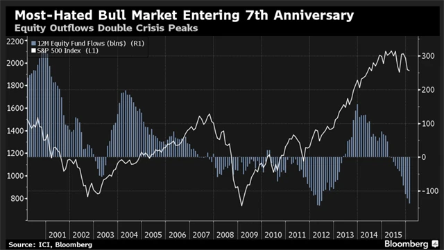 Když lidé vybírají peníze, mají akcie (paradoxně) tendenci následně posilovat. Vyplývá to z analýzy dat shromážděných agenturou Bloomberg a Investment Company Institute od roku 1984. Ve 12 případech, kdy fondy zažily měsíční odliv kapitálu ve velikosti minimálně 2 směrodatných odchylek od historického průměru, rostl S&P 500 v následujících šesti měsících průměrně o 7,1 % (normální výnos je 3,9 %).
