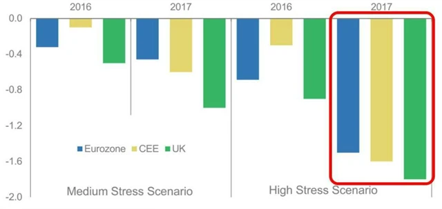 Podle jejich nejhoršího scénáře by mohl Brexit vést v příštím roce k "vymazání" 1,5 % HDP v eurozóně, což by podle dat Eurostatu znamenalo více než 150 miliard EUR. Jak je patrné z grafu, nejvíce to odnese samotná Británie, ale eurozóna bude trpět téměř stejně.