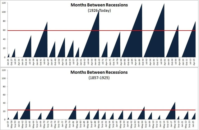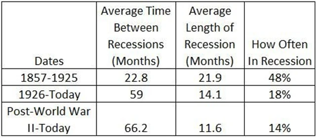 V éře po druhé světové válce se recese zkracují a délka období mezi recesemi narůstá. Také se zkracuje doba trvání recese. Nemělo by být žádným překvapením, že se ekonomika stává stabilnější a zralejší. Když se podíváme na dobu, kdy byly USA ještě rozvíjející se ekonomikou, odhalíme zajímavá čísla: