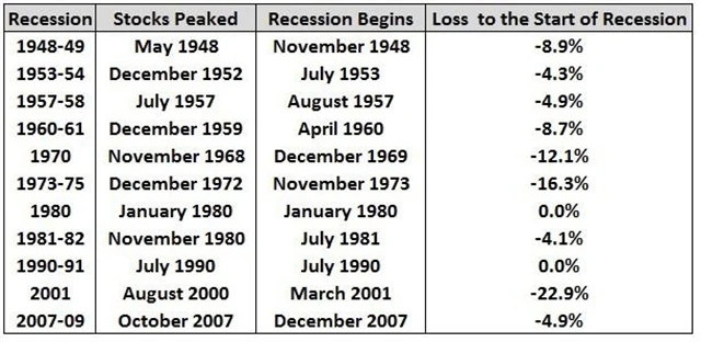 Akcie mají tendenci k obratu (ať už k růstu, nebo poklesu) jako první, než je následuje ekonomika. Ve chvíli, kdy v ekonomice dochází k recesi, má zpravidla akciový trh to nejhorší za sebou. Vezměme si jako příklad technologickou bublinu - akcie ztratily 23 %, než ekonomika upadla do recese. Během recese už přišly jen o 15 % hodnoty.