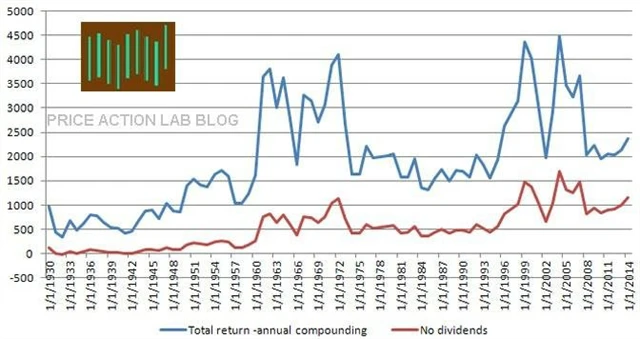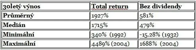 Maximální 30letý výnos z investice do amerických akcií (4 489 %) byl realizován v roce 2004, kdy byl vliv dividend na celkovém výnosu 200 %. To znamená, že po odečtení vlivu dividend by byl celkový výnos asi třetinový. V roce 2014 byl již vliv dividend na výnos stejný jako vliv kapitálového výnosu. Kvantitativní uvolňování posílilo vliv cenového vývoje na celkový výnos a snížilo vliv dividend.