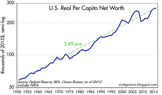 A výčet pozitiv pokračuje. Reálné čisté jmění na obyvatele totiž v USA dosáhlo 270 tisíc dolarů, což je rovněž historicky nejvíce. Průměrný roční přírůstek od roku 1951, kdy se začal tento údaj sledovat, činí 2,4 %. "Není na tom nic neobvyklého, protože život v USA se zlepšuje po generace."