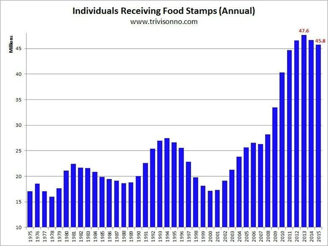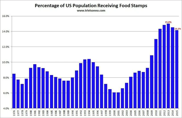 Čísla o bohatství Američanů jsou sice hezká, ale skutečnost tak růžová není. Kromě rekordního bohatství v posledních letech se stále více lidí ocitá na hranici chudoby a je odkázána na pomoc státu. V roce 2013 padl v USA jiný, poněkud smutný rekord, kdy Program doplňkové potravinové pomoci (Supplemental Nutrition Assistance Program, SNAP), který nahradil starý model potravinových lístků, využívalo 47,6 milionu Američanů. Za poslední dva roky sice tento počet mírně klesl, ale v roce 2015 to přesto bylo 45,8 milionu lidí. Od roku 2008 vzrostl počet těchto lidí o 62 %.