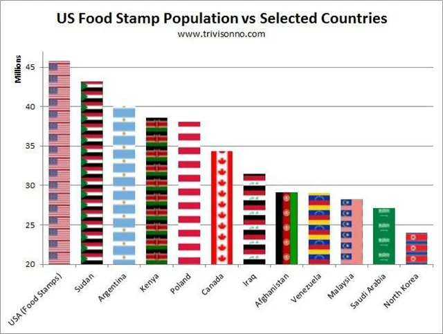 Z těchto čísel vyplývá, že více než 14 % Američanů je odkázáno na potravinovou pomoc, což znamená, že každý sedmý občan USA není schopen se sám uživit. Mezi jednotlivými státy v rámci USA samozřejmě jsou velké rozdíly. Přes 20 % lidí pobírá pomoc ve státech Mississippi a Nové Mexiko, špatně jsou na tom také Oregon, Tennessee, Západní Virginie a státy na jihovýchodě země. Nejlépe jsou na tom státy v oblasti středozápadu.