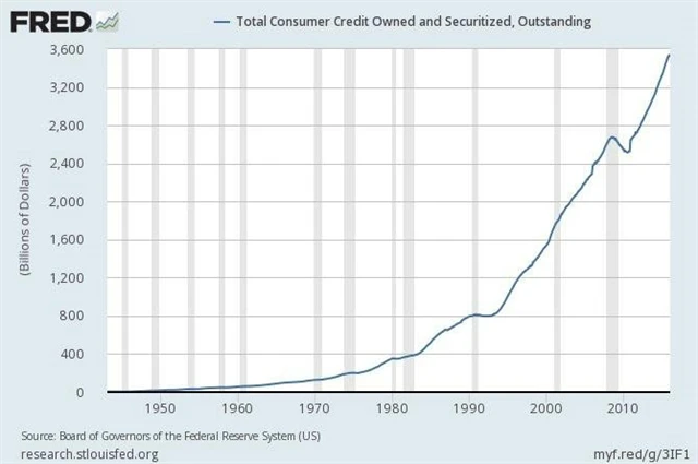Na druhou stranu je potřeba připomenout, že zadlužení USA vzrostlo od roku 1970 58násobně, a to na 58 bilionů dolarů. A přestože na předchozím grafu závazky Američanů klesají, jejich dluhy po poklesu v roce 2008 opět rychle rostou. V lednu 2016 činily dluhy spotřebitelů v USA přes 3,5 bilionu dolarů a od srpna 2010, kdy dosáhly dočasného "minima", vzrostly bezmála o 41 %. To nevypovídá nic o zlepšující se situaci amerických domácností, byť růst na dluh je (nejen) v USA běžná věc. Otázkou je, zda běžná znamená udržitelná.