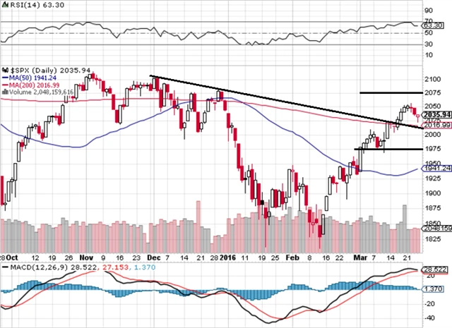 Americké akcie v uplynulém týdnu zlevnily, a indexy tak přerušily pětitýdenní růstovou sérii. Dow od pondělí do čtvrtka klesl o 0,49 %, S&P 500 odepsal 0,66 % a Nasdaq Composite ztratil 0,46 %. Zásadní makrodata nevyšla, dění na burzách tak ovlivňoval zejména vývoj cen ropy. Úterní teroristické útoky na bruselské letiště Zaventem a stanici metra Maalbeek akcie v USA v úvodu seance poslaly do červených čísel, brzy ale trhy ožily a ztráty smazaly. Ropa v první polovině týdne mírně zdražila, ve druhé ale o zisky přišla a naopak mírně zlevnila. Brent týden zakončil na 40,44 USD za barel a ropa WTI na 39,60 USD za barel.