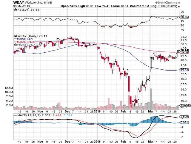 Další společností, na kterou se Nichols doporučuje zaměřit, je Workday, jedna z nejrychleji rostoucích firem v oblasti sdílení softwaru přes internet (software-as-a-service - SaaS). Růst jejích příjmů se odhaduje na 33 % v letošním roce a 31 % v roce 2017.