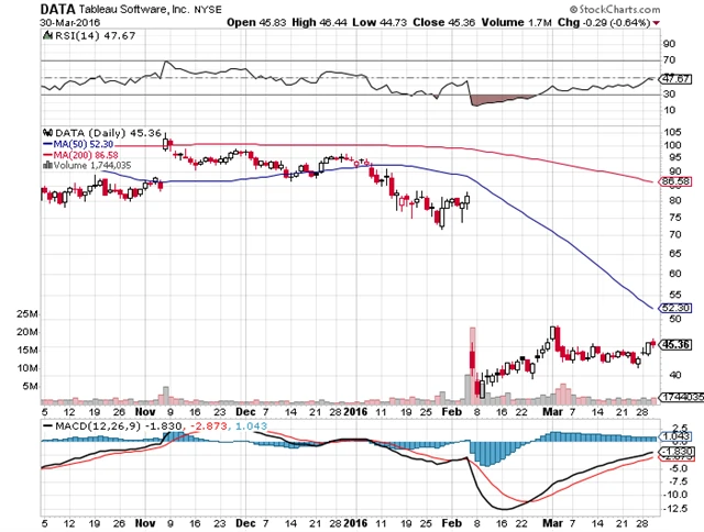 Třetí v pořadí je společnost Tableau Software nabízející obchodní analytický software. Pro mnohé může jít o překvapení, jelikož akcie firmy v lednu ztratila v průběhu jednoho dne 50 % hodnoty. Společnost totiž přišla s překvapivě pesimistickým výhledem tržeb i zisků a nervozita na trzích udělala své. Přesto se u společnosti očekává růst tržeb o 28 % letos a o 27 % v příštím roce.
