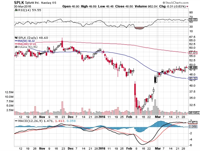 Další společností v seznamu je Splunk, rovněž poskytovatel softwarového vybavení, kterého podle Nicholse, na rozdíl od předešlé firmy, Wall Street miluje. I když akcie od poloviny února přidala přes 50 % (po předchozím rychlém sešupu), od svého vrcholu je ještě daleko. Velmi dobré výsledky v posledním čtvrtletí roku 2015 a očekávání růstu příjmů o 32 % letos a o 29 % v roce 2017 nabízejí stále solidní růstový potenciál.