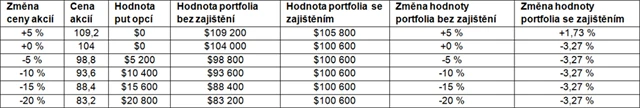 Tabulka shrnuje potenciální ztráty při poklesu ceny akcií při zajištění i bez zajištění opcemi.