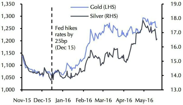 Julian Jessup, hlavní komoditní analytik Capital Economics, si myslí, že Fed letos zvýší sazby dvakrát, ale na vztah úrokových sazeb a ceny zlata má poněkud jiný názor. "Konvenční přístup říká, že zpřísnění monetární politiky Fedu je pro zlato špatné, a to především proto, že vyšší sazby v USA mohou vést k posílení dolaru a zvýšení nákladů na držbu komodit. Cena zlata v návaznosti na zveřejněné zápisky z jednání FOMC skutečně klesla. Nicméně je nutné poznamenat, že ceny zlata a stříbra v týdnech následujících po prosincovém zvýšení sazeb celkem rychle rostly," říká Jessup.