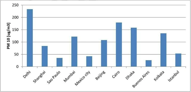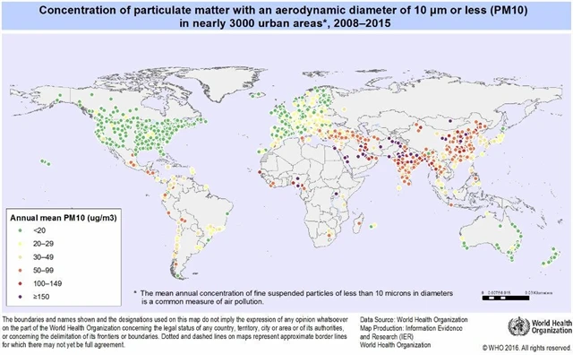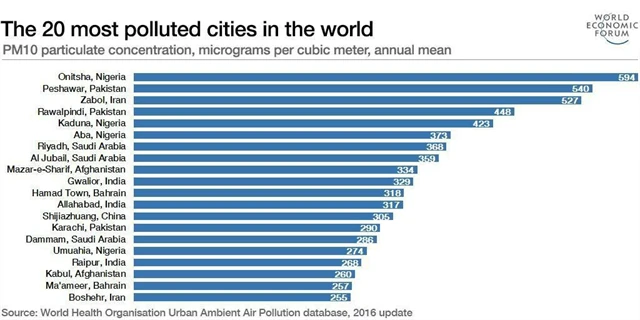 Poslední data o vývoji znečištění ovzduší z let 2011 až 2015 ukazují, že doporučením WHO nevyhovuje 98 % měst nad 100 tisíc obyvatel v nízkopříjmových a středněpříjmových regionech. Z tří tisíc sídel v databázi WHO je vůbec nejhorší situace v nigerijském městě Onitsha, které převyšuje doporučené úrovně hrubších pevných částic ve vzduchu (sekundární prašnost, PM10 - 10 mikrogramů částic na metr krychlový vzduchu) 30násobně. Následují pákistánský Péšávar a íránský Zábol. Nigérie je v první dvacítce měst s nejvíce znečistěným ovzduším zastoupena čtyřikrát, následují Indie (3), Saúdská Arábie (3), Pákistán (3), Afghánistán (2), Írán (2), Bahrajn (2) a Čína (1).