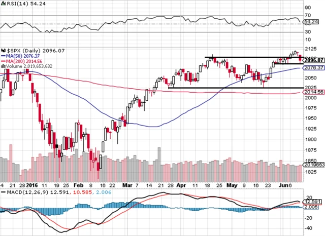 "Index S&P 500 od pondělí do čtvrtka uzavíral nad 2 100 za velice nízkých objemů obchodů. V pátek psychologicky zajímavou hladinu otestoval a také prolomil. Trh je na tom tedy obdobně jako před týdnem (pokles o bezvýznamných 0,15 %). Zóna od 2 100 k historickým maximům je pro býky zatím tvrdým oříškem," píše v pravidelném technickém komentáři pro Investiční web opční obchodník a zakladatel serveru Optionslock.cz Josef Košťál. "S blížícím se referendem o setrvání Spojeného království v EU může nervozita na trzích stoupat, zajišťování pozic zesílí, a proto k žádné nákupní horečce pravděpodobně nedojde. Také proběhne červnové zasedání FOMC, vyjdou další fundamentální ekonomická data a v pátek vyprší měsíční opce. Stále se děje něco, co má potenciál ovlivnit vývoj na trzích a rozhodování investorů."