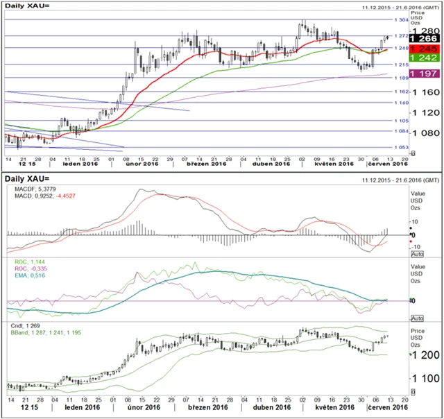 "Cena zlata v posledních dnech překonala 20denní, 50denní i 200denní klouzavý průměr, drží se však pod maximem 1 304 USD z minulého měsíce. Technické indikátory ovšem ukazují prorůstové tendence, ROC jsou téměř na nule (ROC60 zůstává v těsné blízkosti ROC20), MACD překonala spouštěcí linii a Bollinger Bands se blíží k horní hranici rozpětí," říkají Urbánková a Ďurčová.