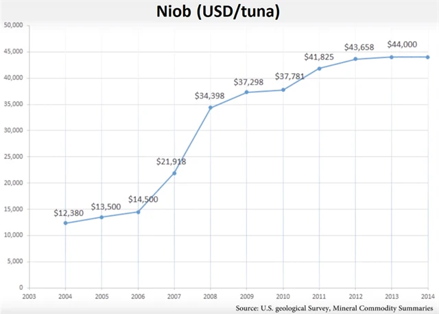 Od roku 2004 se cena niobu během deseti let zvýšila z 12 380 na 44 000 USD za tunu. Loni cena kovu kvůli nižší poptávce po oceli a poklesu aktivity v oblasti stavby ropovodů a plynovodů vlivem propadu cen ropy a zemního plynu mírně klesla, stále se ale drží nad 40 000 USD za tunu. Roční poptávka po niobu se pohybuje mezi 90 000 a 100 000 tun.