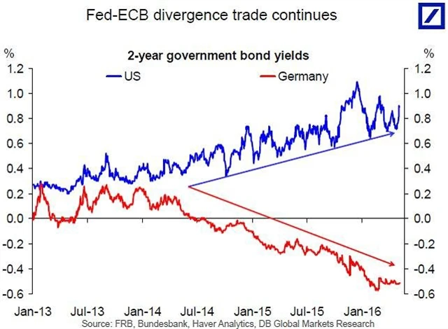 Fed se možná snaží být čitelný, ale v posledních měsících se mu to tak úplně nedaří. Nejprve se čekala čtyři zvýšení úroků do konce roku 2016, pak dvě, trh pak dokonce neviděl jako pravděpodobné ani jedno. Aktuálně to vypadá na jedno zvýšení ještě během léta. Uvidíme, dluhopisový trh se na divergenci měnových politik v eurozóně a v USA každopádně chystá kontinuálně už dva roky. A trh se mýlí málokdy.