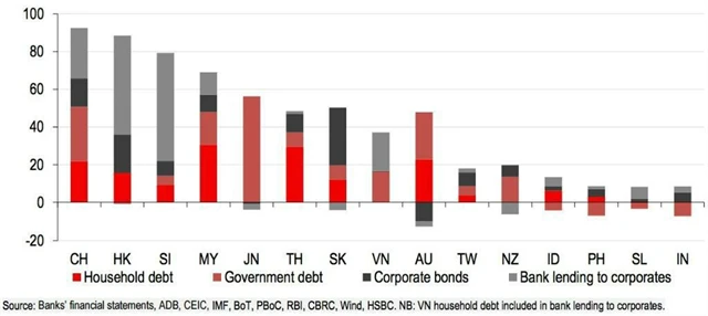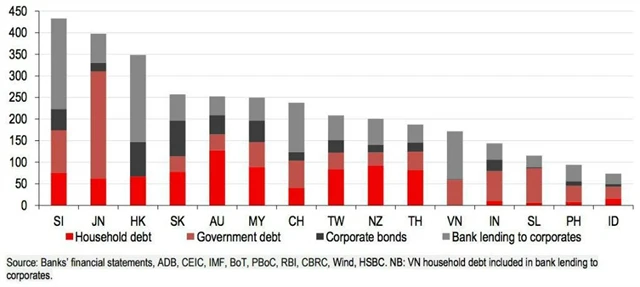 Rychle rostoucí dluh Číny sice vyvolává ve světě financí obavy, ale druhá největší ekonomika světa není jedinou extrémně zadluženou zemí asijsko-pacifického regionu. Podle analytiků z HSBC je závislost ekonomik na rostoucím dluhu neudržitelná a v budoucnu může vyvolat mnoho problémů.