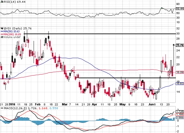 Index S&P 500 neprolomil hladinu podpory na 2 020 až 2 000. Výsledek referenda ve Spojeném království se na trzích projevil tak, jak bylo v případě příklonu k brexitu očekávané. Nepříznivá makrodata z USA byla ve stínu dění v Evropě mimo pozornost trhu. Případné prolomení supportu na hladině 2 000 by přispělo ke zhoršení již tak špatného výhledu. Těžko hledat informace, které by indexy v nejbližší době povzbudily k růstu a testování historických maxim. Pozitivním výsledkem pro následující období bude již to, že se poklesy nezmění v panické výprodeje. Převládají obavy z neznámého.