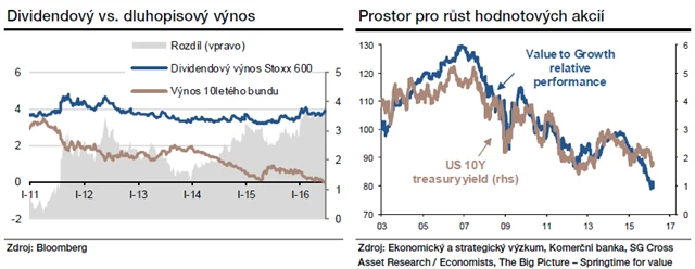 Zajímavý je pohled na graf níže vpravo, kde lze vidět úzkou vazbu mezi výnosem 10letého amerického dluhopisu a relativní výkonností hodnotových akcií vůči růstovým. V období poklesu sazeb se dařilo spíše růstovým akciím, když tyto firmy obecně více investují a jsou zadluženější, a proto jejich citlivost na pohyb úrokových sazeb je vyšší. "Výraznější pokles sazeb již nečekáme. Od konce letošního roku by naopak mohlo začít docházet k jejich růstu v souvislosti s utahováním měnové politiky v USA. Z toho by měly více těžit akcie společností, které mají již svůj největší investiční cyklus za sebou a zaměřují se na výplatu stabilních dividend či odkup akcií," píší ve své aktuální zprávě Josef Němý a Miroslav Frayer, analytici z Komerční banky.