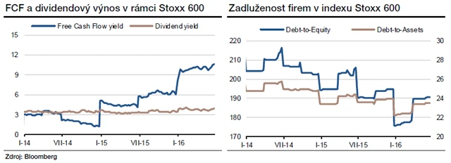 Následující graf vlevo ukazuje, že v rámci evropského indexu STOXX Europe 600 od roku 2015 tento ukazatel převyšuje dividendový výnos a v letošním roce dále vzrostl. Přitom však volné cash flow neroste na úkor zvyšujícího se zadlužení, když je patrné, že ukazatele zadluženosti se v rámci 600 evropských firem snižují. Hromadící se hotovost na účtech firem proto představuje další zdroj možného vyššího návratu kapitálu akcionářům.