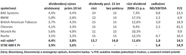 "Vybrali jsme šest velmi atraktivních dividendových titulů. Tyto firmy dokázaly v posledních 15 letech až na drobné výjimky pravidelně zvyšovat své dividendy, a to v průměru o 11,6 % ročně. Průměrný očekávaný dividendový výnos této šestice je nyní 4,4 % oproti výnosu 3,9 %, který nabízí index STOXX Europe 600. Většina těchto firem se navíc pyšní poměrně nízkým zadlužením," vysvětlují Frayer s Němým.