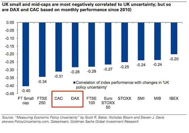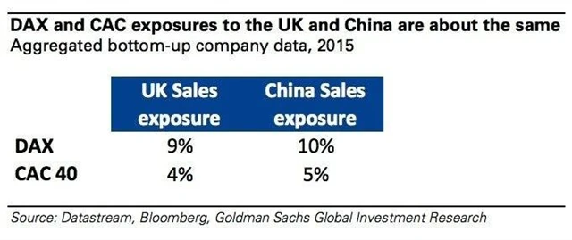 Sharon Bellová z Goldman Sachs upozorňuje na vysokou expozici evropských firem vůči rizikům spojeným s brexitem. Nejhůře by podle ní případné rozhodnutí Britů odejít z EU a jeho důsledky zasáhly německé a francouzské firmy. A síla, s jakou by byly podniky v Německu a Francii zasaženy, by podle ní byla zhruba stejná jako rána, kterou jim uštědřilo zpomalování expanze čínského hospodářství. Z pohledu obchodu je totiž expozice Francie a Německa vůči Británii podobná jako vůči Číně.