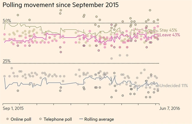 Referendum, které o budoucnosti Británie rozhodne, je naplánované na 23. června. Průzkumy veřejného mínění naznačuj, že výsledek hlasování bude velice těsný. Podle listu Financial Times, který agreguje výsledky předvolebních průzkumů, mají aktuálně převahu zastánci setrvání Británie v unii (45 %) před odpůrci jednotné Evropy (43 %). Nerozhodnutých je ale stále více než 11 % lidí. Výsledky posledních anket agentury YouGov a organizace TNS navíc naznačují těsné vítězství odpůrců servání země v EU.