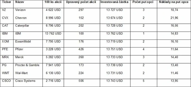 Budeme uvažovat minimální investici do 100 kusů akcií u nejdražšího titulu. Do ostatních titulů budeme investovat stejný objem peněz. Minimální objem 100 akcií je zvolen proto, že jedna put opce zajišťuje přesně 100 akcií.